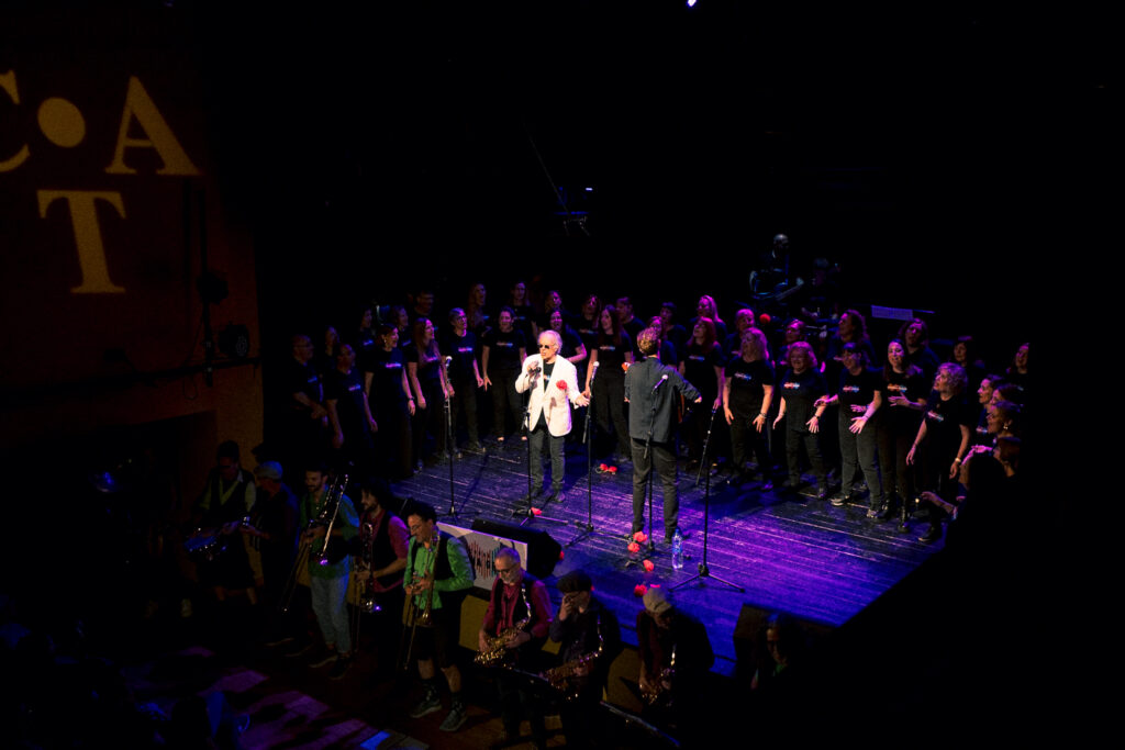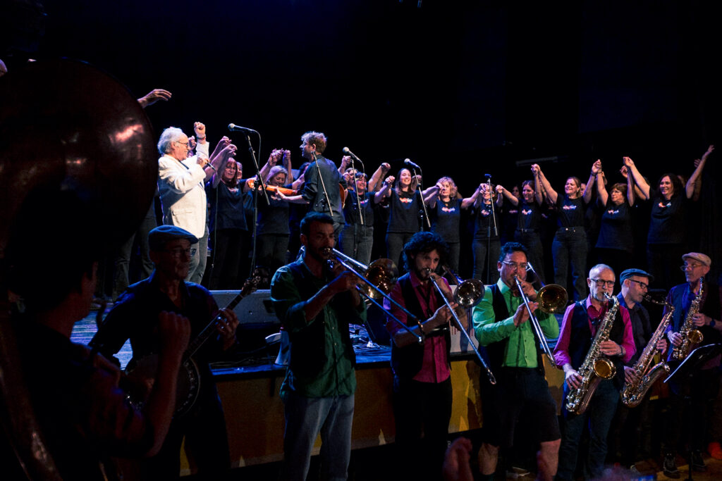 70) Cantando Sweet Caroline con la coral de la Escola Vedruna, en el concierto del Tradicionarius de Gràcia, con la Barcelona Marching Band. Entre este concierto y el de la foto anterior, han podido pasar 61 años. Del relato Del miedo al amor.