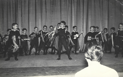 69) Con ocho años, debió ser mi primera actuación en un escenario, del colegio de las monjas. Yo soy el del centro, a mi izquierda detrás, con una guitarra, mi hermano Chufer. Del relato Sor Coro.